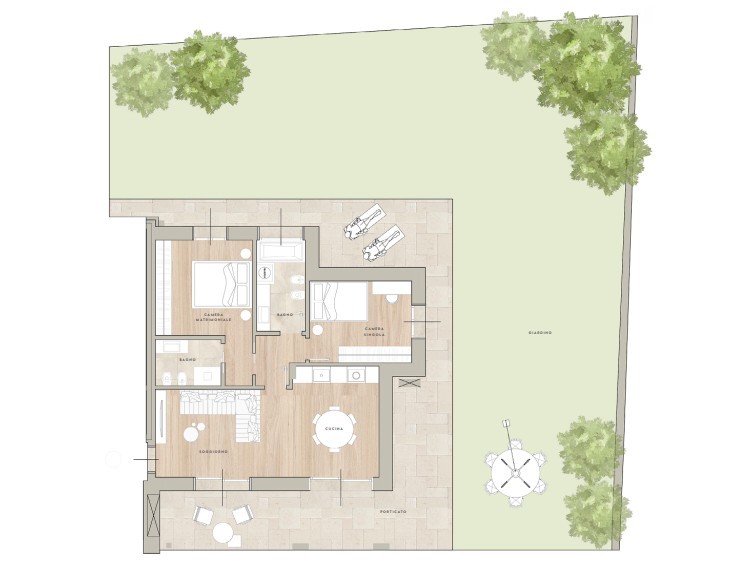 DIMORA MAURI - Appartamento n' 2 - La dimora si sviluppa al piano terra, circondata da un giardino esclusivo di oltre 200 mq. Sin dall’ingresso ci accoglie un grande ambiente open space con zona living e cucina. Le importanti finestrature permettono di avere sempre un’ampia veduta sul giardino esterno e di accogliere l’illuminazione naturale dentro la dimora. Dal disimpegno si accede alla zona notte, composta da due camere da letto, una singola e una matrimoniale con bagno en suite, e a un ulteriore bagno di servizio. L’intero perimetro esterno dell’appartamento è circondato da un comodo portico che crea una zona lounge all’aperto, preservandone la privacy grazie alle coperture pensate appositamente per godere appieno di un gratificante relax. Visita il nostro sito: www.dimoramauri.it